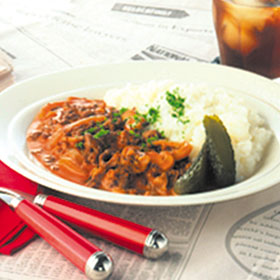 | 2 | 玉ねぎの色が透き通ってきたらトマトスープ、水を加えコンソメ、バジル、オレガノを入れ、混ぜながらゆっくり煮込んでください。 |